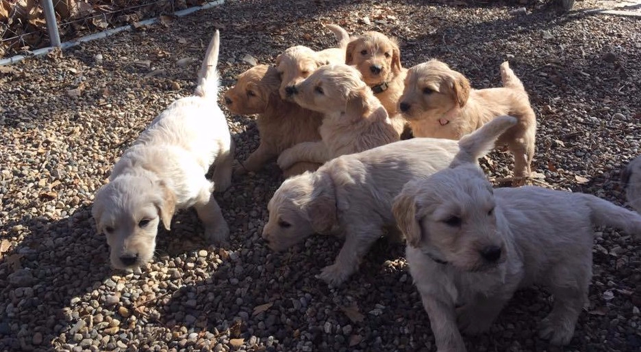 Hi! We’re goldendoodles! We like biting each others’ ears, exploring the backyard, and cuddling up in people’s arms. When we grow up, we are sweet and smart pets. We are lovable and low-shedding dogs, which make us great for families and those with allergies.