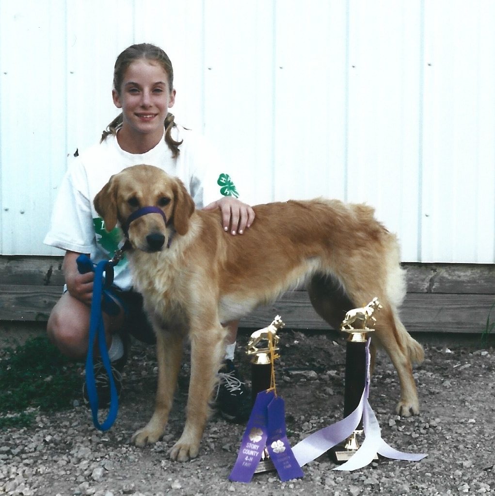 When Janae was in middle school, her family purchased a golden retriever puppy named Sandy and began a “golden era” that has never stopped. Sandy was an loyal companion during farm chores, country walks, 4-H obedience training, and more. Her amazing temperament and impressive intelligence made her a great candidate for breeding. Janae received her first experiences caring for puppies from helping with Sandy’s golden retriever litters.